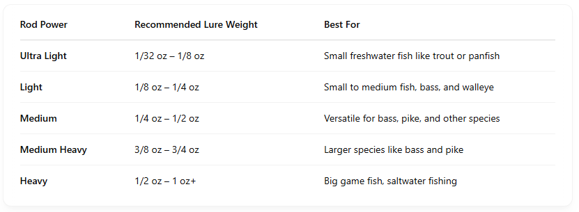 To help you make the best decision when choosing a rod for your fishing trip, we’ve put together a simple chart that matches rod power to the appropriate lure weight range. This will help you select the ideal setup for the fish you’re targeting: